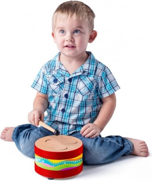 Hra na bubínek podporuje přirozený rozvoj rytmického cítění, jemné motoriky i soustředění. Součástí balení je dřevěná palička, se kterou mohou děti bezpečně zkoušet první rytmy a písničky.