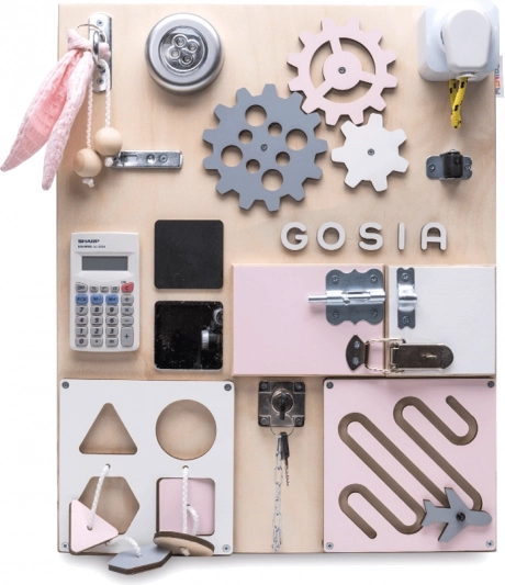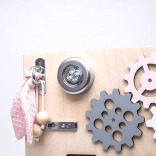 Na montessori desce jsou různé zámky, zvonky, trubky, okénka, knoflíky, bloky, knoflíky a další doplňky. Dítě při hře poznává nové tvary a materiály, a proto je deska edukativní hračkou a neexistuje lepší způsob učení než hrou.