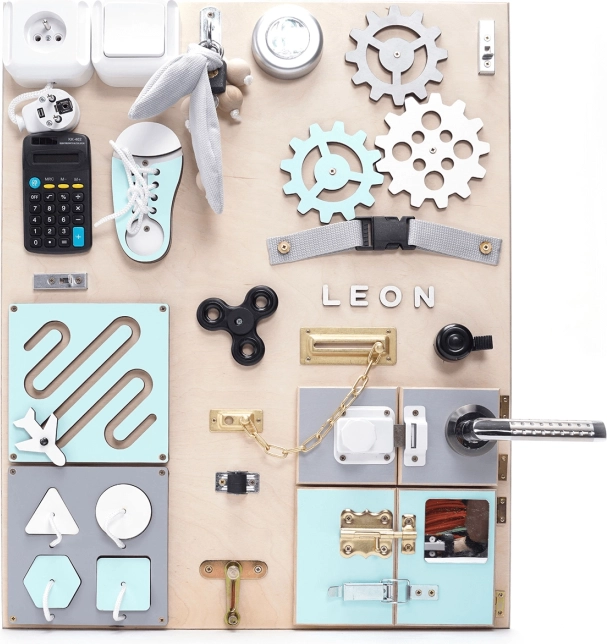 Na montessori desce jsou různé zámky, zvonky, trubky, okénka, knoflíky, bloky, knoflíky a další doplňky. Dítě při hře poznává nové tvary a materiály, a proto je deska edukativní hračkou a neexistuje lepší způsob učení než hrou.