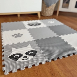 Tato hrací podložka s motivem mývala a otisků tlapek promění každý dětský pokoj v bezpečné a měkké místo na hraní. Jednoduché a snadné sestavení díky interlockových hranám a odolnému materiálu.