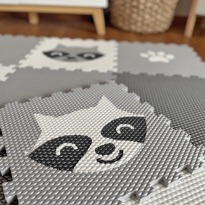 Hrací podložka se vyznačuje rozkošnými motivy mývalů a tlapek, které dodají hracímu prostředí hravý nádech.