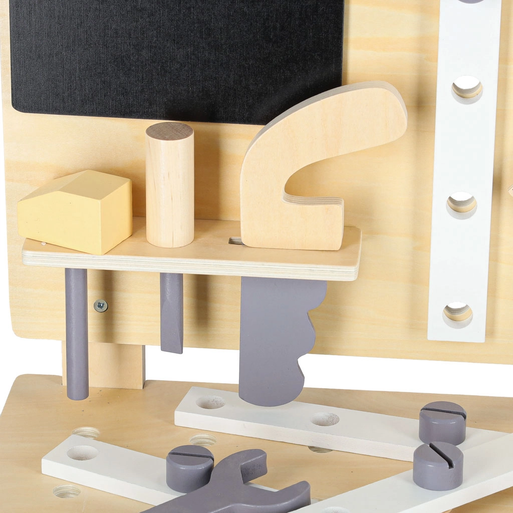 Dřevěný dílenský stůl je ideální pro děti, které milují opravování a stavění. Díky bohaté sadě nástrojů a příslušenství si vyzkouší šroubování, zatloukání, měření i otáčení ozubených kol. Stabilní provedení v neutrálních barvách skvěle zapadne do dětského pokoje.