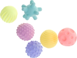 Sada obsahuje šest míčků s různými strukturami: malými a velkými výstupky, prohlubněmi, proužky a ježky s bodci. Učí koordinaci, rozpoznávání barev a tvarů, a poskytuje relaxační masáž, která uklidňuje a připravuje dítě ke spánku.