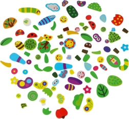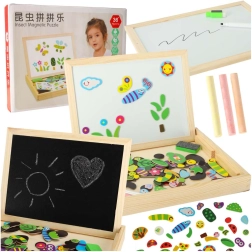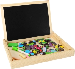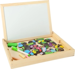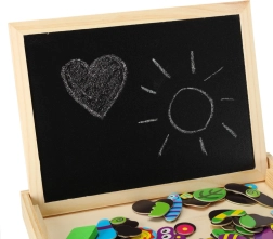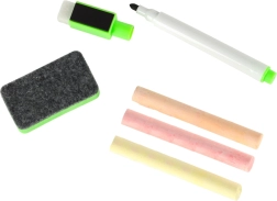 Balení obsahuje: oboustrannou tabuli, 100 magnetů, barevné křídy, houbičku, fixy