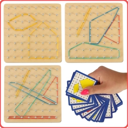 Objevte zábavný způsob, jak děti seznámit se základy matematiky – tvary, úhly a symetrie. Na dřevěné desce s hustou mřížkou kolíků děti napínají gumičky v různých délkách a barvách a vytvářejí obrazce podle karet nebo vlastní fantazie. Hra posiluje koordinaci oko–ruka, soustředění a logické uvažování.