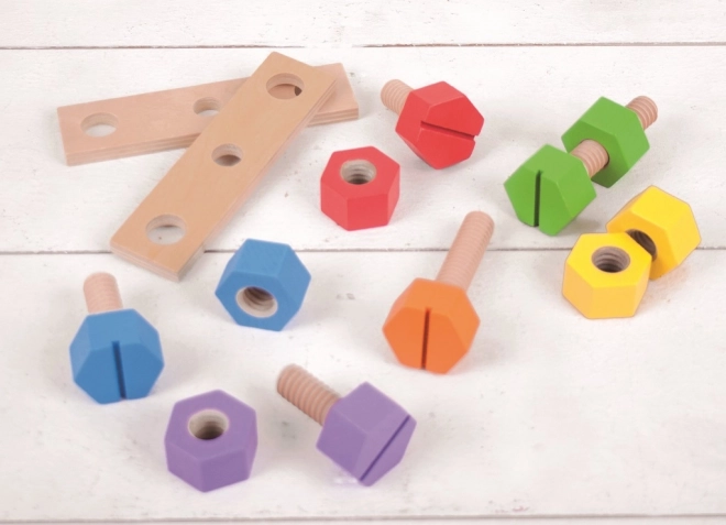 Tyto robustní dřevěné matice a šrouby mají ideální velikost pro malé ručičky a dodávají se v řadě jasných barev. Dodáváno v průhledné plastové nádobě se šroubovacím uzávěrem a rukojetí - ideální pro mladé inženýry, kteří jsou na cestách! Pomáhá rozvíjet obratnost a koordinaci ruka-oko. Vyrobeno z vysoce kvalitních, zodpovědně získaných materiálů. Splňuje aktuální evropské bezpečnostní normy. Skládá se z 20 dílů. Hlavní vlastnosti: obsahuje 20 dílkůpomáhá rozvíjet obratnostpraktické uskladnění