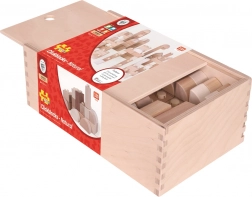 Stavebnice je vyrobena z odolného dřeva s hladkým povrchem pro bezpečné hraní. Praktický dřevěný box se zasouvacím víkem usnadňuje ukládání a pořádek v dětském pokoji.