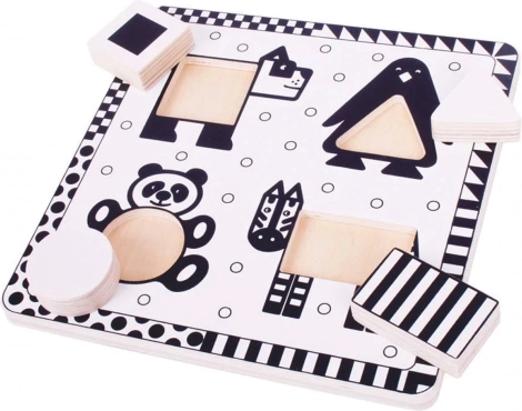 Černobílé vkládací puzzle BIGJIGS TOYS je navrženo speciálně pro nejmenší děti. Kontrastní provedení pomáhá miminkům lépe zaostřit a vnímat tvary, zatímco čtyři velkorysé dřevěné dílky s motivy zvířátek se pohodlně vkládají do příslušných otvorů.
