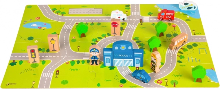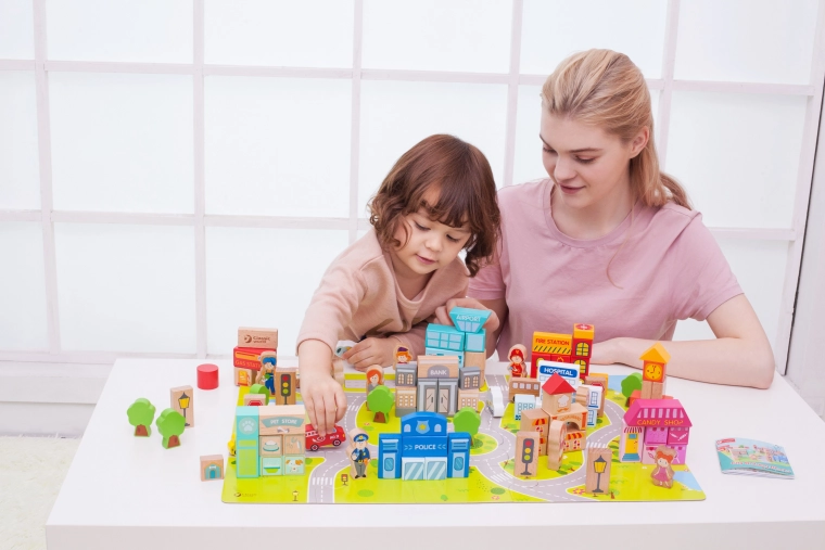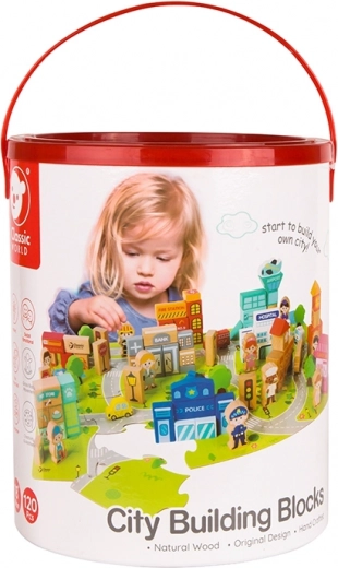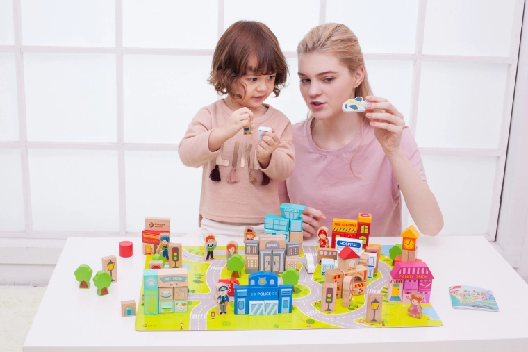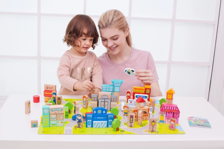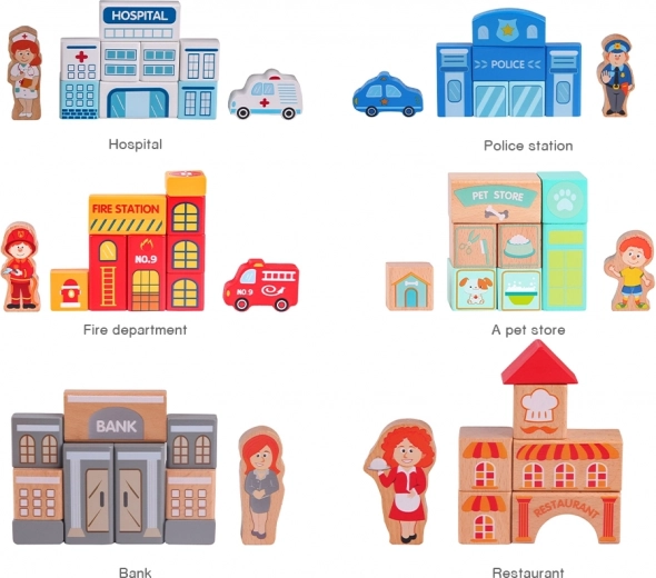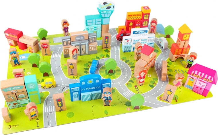 Díky tomuto kompletu děti mohou stavět typické městské budovy jako škola, policejní stanice, hasičská zbrojnice, letiště, nemocnice, banka, restaurace, obchod se zvířaty a další. Hračka je vyrobena z přírodních, biologicky odbouratelných a hypoalergenních materiálů, což zajišťuje maximální bezpečnost.
