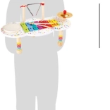 Xylofon, bubínek, triangl a činel jsou přehledně uspořádány na jednom stabilním stolečku, aby si děti mohly snadno zkoušet různé zvuky a rytmy.