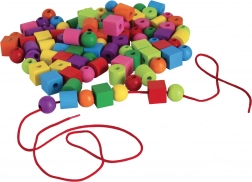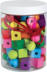 Dřevěné korálky přicházejí v různých tvarech, jako jsou koule a kostky, a v pestrých barvách, které učí děti rozpoznávat barvy.