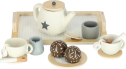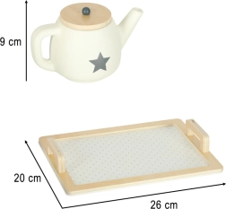 Elegantní dřevěný čajový set v neutrálních barvách s hvězdičkovými detaily je ideální pro dětské čajové dýchánky. Děti mohou servírovat čaj, mléko i „dezert“, trénovat zdvořilost a komunikaci a zároveň rozvíjet fantazii.