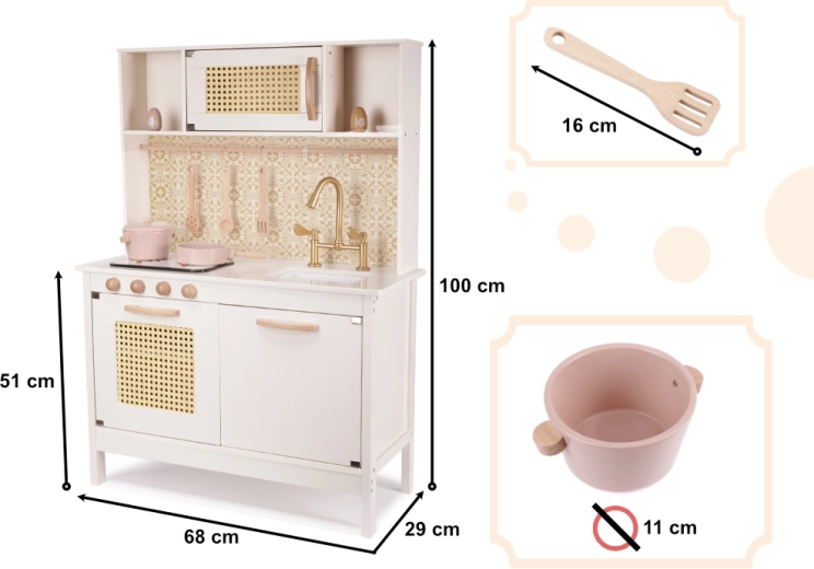 Důmyslné úložné prostory a praktické doplňky – hrnec s pokličkou, pánev, sůl a pepř, naběračka, děrovaná lžíce a obracečka – udrží „kuchyni“ v pořádku a naučí děti organizaci prostoru. Většina prvků je z dřeva, povrch je hladce broušený a opatřen netoxickými barvami pro maximální bezpečí.