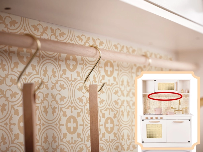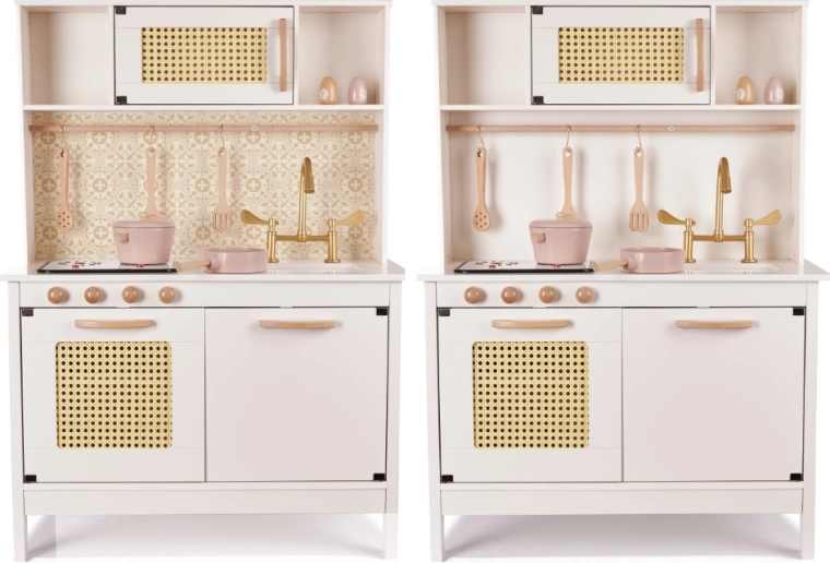 Podpořte fantazii a jemnou motoriku vašich dětí s kuchyňkou, která vypadá jako opravdová. Otočná dřevěná kolečka, otevírací dvířka, lišta s háčky a vyjímatelný panel varné desky s efekty světla a zvuku dělají z vaření zábavu i poučení bez rizika. Oboustranné pozadí (hladká krémová/ornamentální tapeta) umožní snadno měnit vzhled kuchyňky podle nálady.
