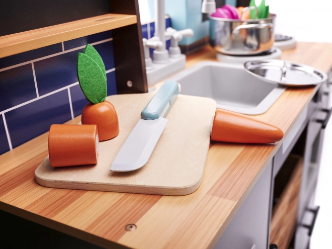 Velká dřevěná dětská kuchyňka LOFT o výšce 96 cm promění pokoj v malé bistro. Nabízí troubu a sporák, lednici s výrobníkem ledu (zvuk), dřez s kohoutkem a úložné organizéry. V balení nechybí kovové nádobí, dřevěný nůž s prkénkem a krájecí zelenina na suchý zip – vše pro realistickou hru na vaření. Hladké hrany a netoxické barvy zajistí bezpečí i dlouhou životnost.