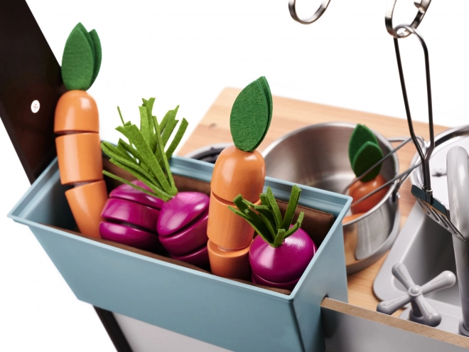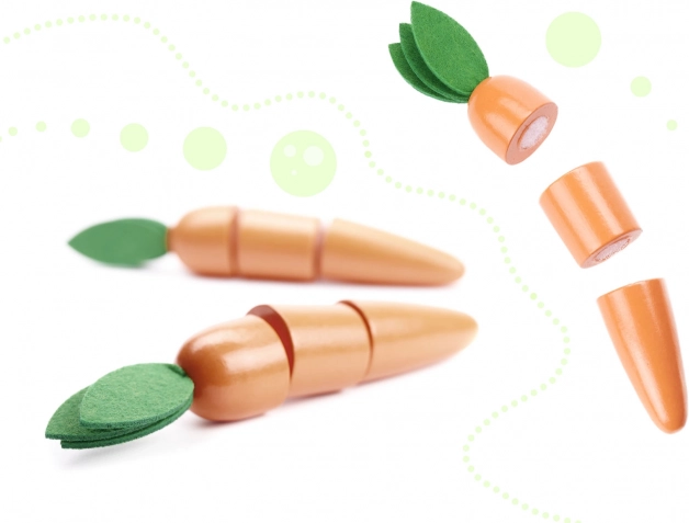 Dřevěný nůž, prkénko a zelenina se suchým zipem umožní bezpečně trénovat krájení, rozvíjet jemnou motoriku i koordinaci ruky a oka.