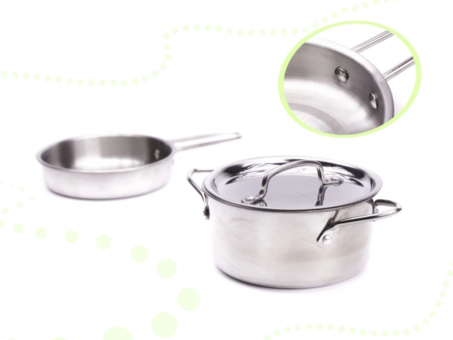 Součástí je stříbrná pánev a hrnec s pokličkou. Odolné kovové nádobí zvládne každodenní hraní a snadno se udržuje.