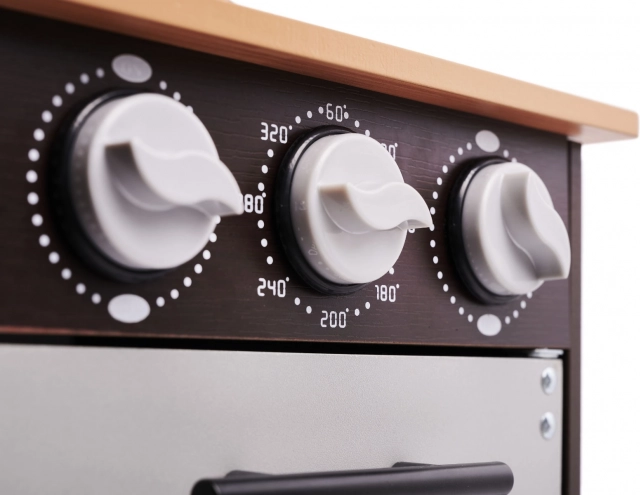 Velké otočné knoflíky s teplotní stupnicí a magneticky zavíraná dvířka trouby s průhledným okénkem dodají hře autentičnost a učí děti základům bezpečného vaření.