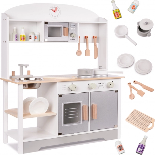 Stylová dřevěná dětská kuchyňka z MDF v neutrálních barvách přináší hodiny kreativní hry. Má kovový vyjímatelný dřez, plotýnky s otočnými knoflíky, troubu s okénkem a displejem, mikrovlnku i odkapávač na nádobí. Součástí je bohaté příslušenství ze dřeva (hrnec, pánev, talířky, nožík, lžíce, obracečka, kořenky) a praktické háčky a police pro uložení. Bezpečné, hladce broušené a natřené netoxickými barvami.