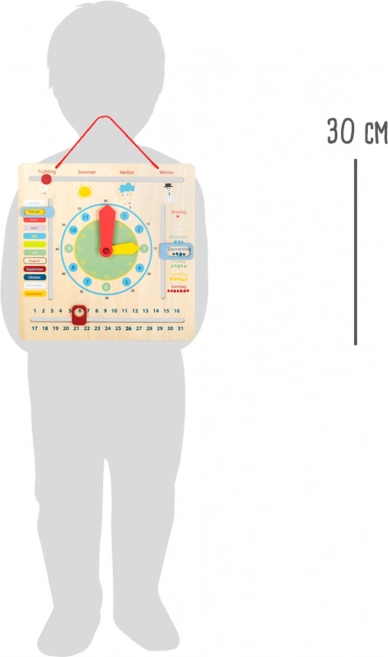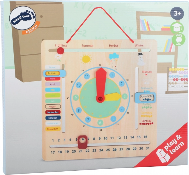 Přehledný dřevěný kalendář pro hravé učení hodin, dnů v týdnu, měsíců a ročních období. Názvy jsou v němčině. Vyrobeno ze 100% FSC dřeva, což zaručuje šetrnost k přírodě.