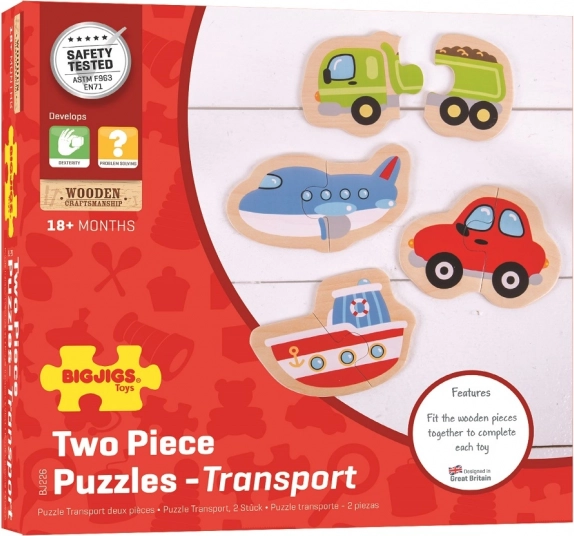 Tato sada dřevěných puzzlí přináší čtyři oblíbené dopravní prostředky, které děti snadno složí ze dvou pevných dílků. Jednoduché tvary, výrazné barvy a příjemné dřevěné provedení lákají k opakovanému hraní a přirozeně podporují rozvoj řeči, rozpoznávání tvarů a barev i soustředění.