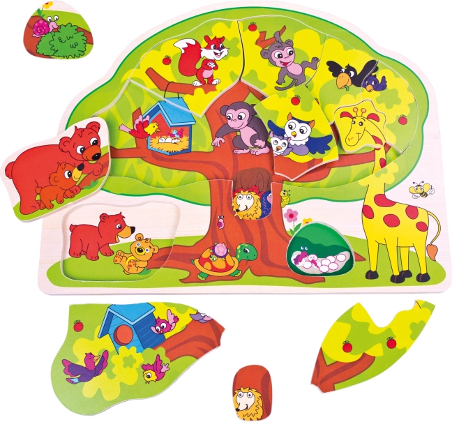 Vkládačka má tvar stromu a obsahuje 11 samostatných dílků se zvířátky a pevnou základnu. Díky odolné překližce je ideální pro každodenní používání doma i ve školce.