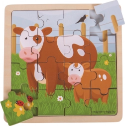 Pečující kravička se svým telátkem zve děti na zelenou louku – čeká je pohodové skládání, které podporuje jemnou motoriku a trpělivost. Díly jsou pevné, hladce opracované a přizpůsobené malým ručkám, takže se s nimi dobře manipuluje. Díky formátu 18 × 18 × 1 cm se puzzle hodí domů i na cesty.