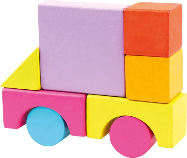 Sada obsahuje kostky různých tvarů – kostky, kvádry, válce, oblouky i trojúhelníky – v jasných barvách, které podporují kreativní a otevřenou hru.