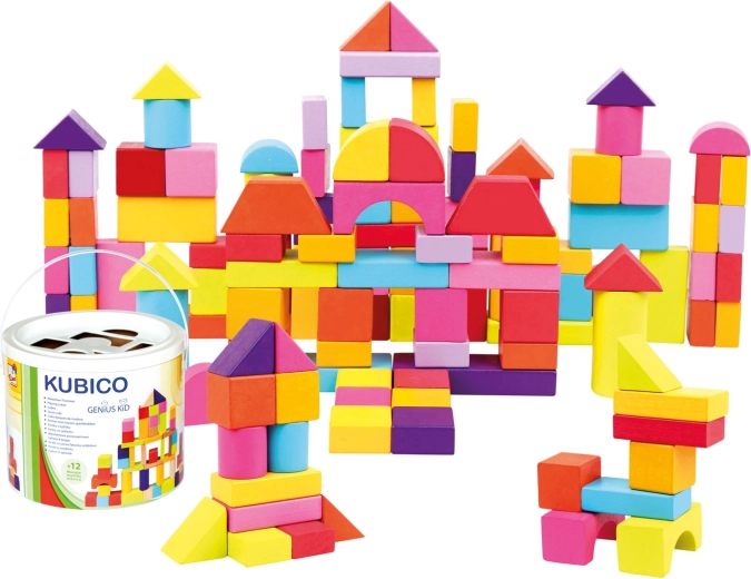 Tato bohatá sada dřevěných kostek v nových barvách přináší dětem nekonečné možnosti stavění věží, mostů i jednoduchých staveb. Praktické balení v kartonovém kyblíku usnadňuje ukládání a přenášení, zatímco víko s otvory funguje jako vkládačka pro procvičení logiky a trpělivosti.