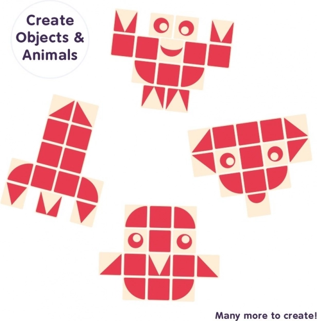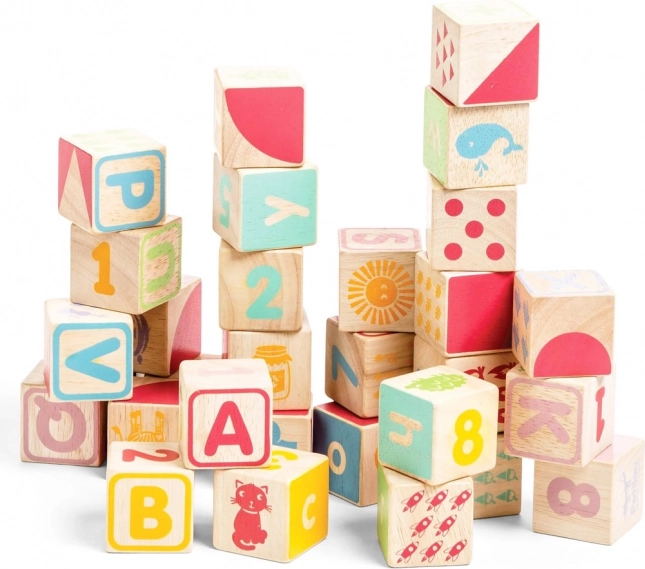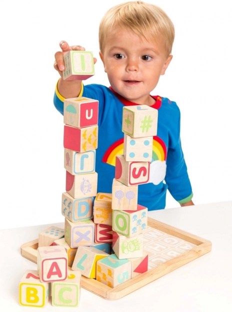 Zaoblené hrany kostek i úložné desky zajišťují komfortní a bezpečnou manipulaci. Hračka je bez obsahu plastu, vyrobená z FSC certifikovaného dřeva s důrazem na etickou výrobu a udržitelnost. Sada podporuje rozvoj kognitivních dovedností, prostorové představivosti a jazykových schopností.