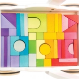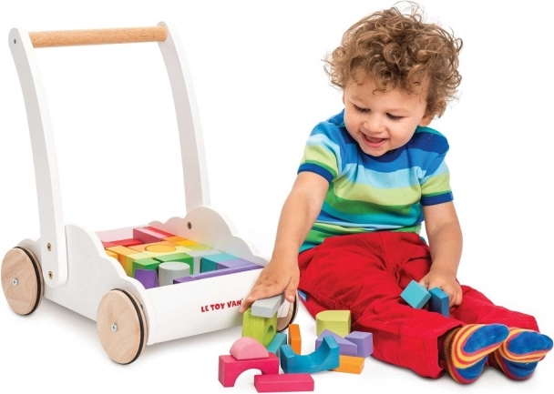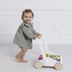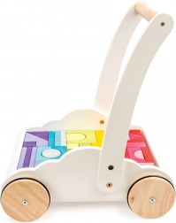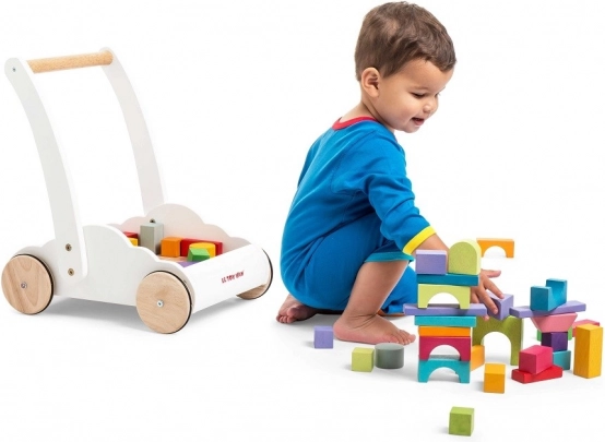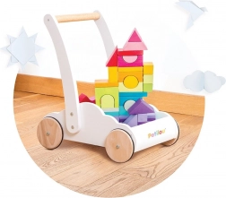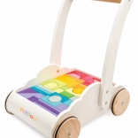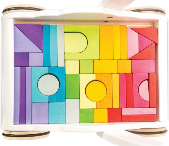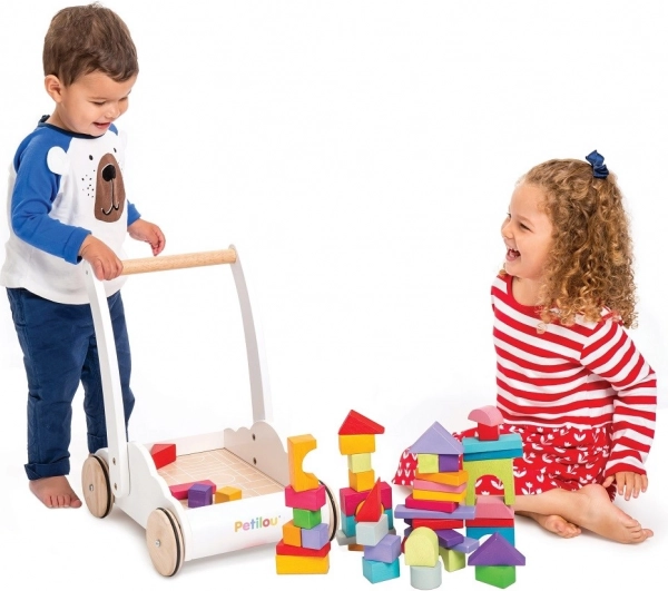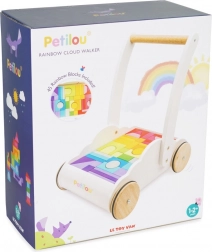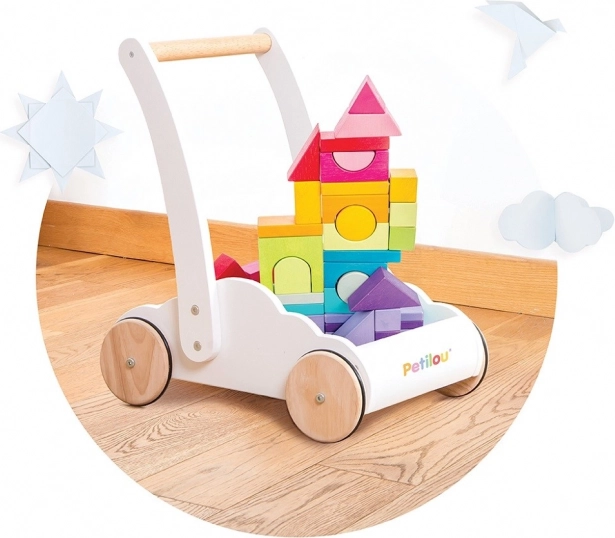 Vozík s duhovými kostkami Petilou je navržen tak, aby dodal dětem při prvních krocích sebejistotu a stabilitu. Je vybaven 45 kostkami v různých barevných odstínech duhy, které podporují rozvoj prostorové představivosti, zručnosti a motoriky.