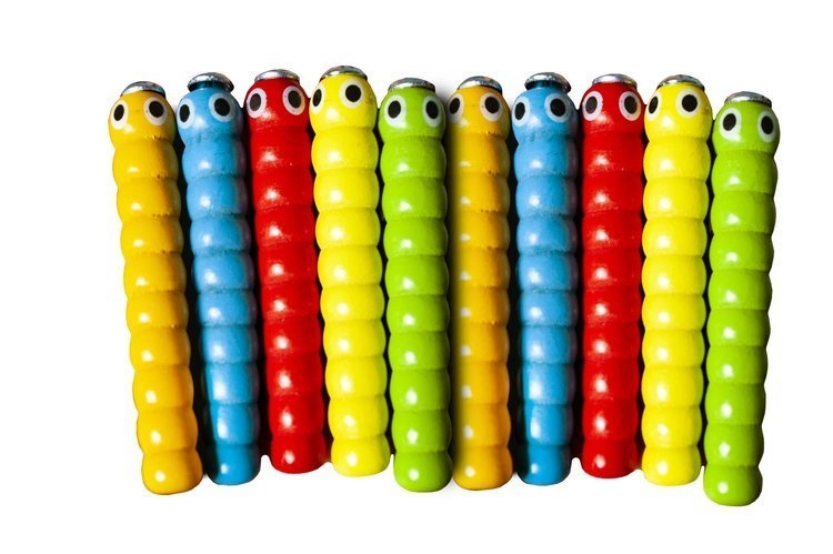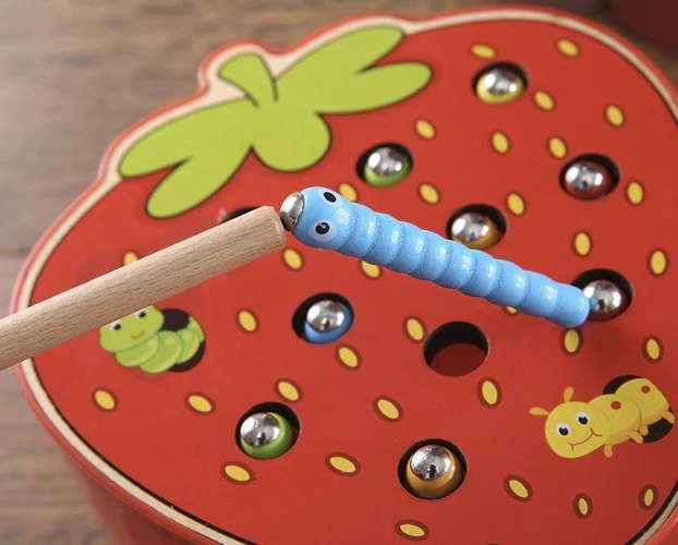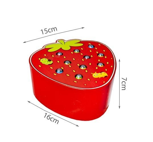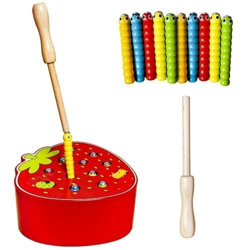 - Kompletní sada: dřevěná jahoda, magnetická tyčka a 10 červíků/gusenic
