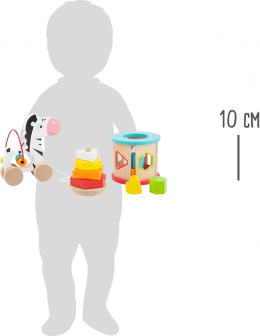Rozvíjejte dovednosti svého dítěte s touto pestrou sadou dřevěných hraček, která nabízí jak zábavu, tak vzdělávací hodnotu. Set obsahuje tahací zebru, stohovací věž a tvarový válec, které jsou ideální pro motorický rozvoj.