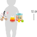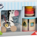 Tato hrací sada je navržena pro nejmenší děti a nabízí rozmanité aktivity, které podporují motorický rozvoj. Každá hračka v sadě je pečlivě vyrobena z dřeva a má atraktivní barevný design, který láká děti ke hře: