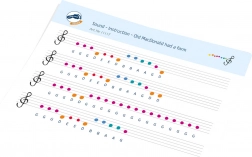 Přiložené barevně značené notové listy (např. „Old MacDonald“) pomáhají dětem přiřazovat barvy k tónům a rychle si osvojit první melodie.