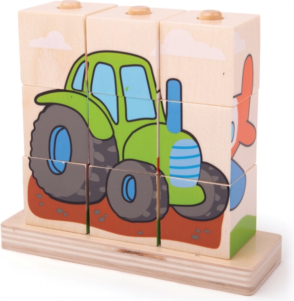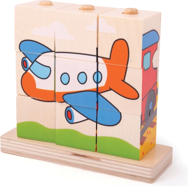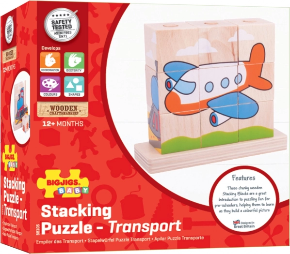 Dřevěný puzzle Bigjigs Baby Dopravní prostředky je ideální hračkou pro rozvoj motorických dovedností a koordinace rukou a očí u dětí. Obsahuje 10 kusů dřevěných bloků s čtyřmi dopravními scénami: vlak, auto, traktor a letadlo.