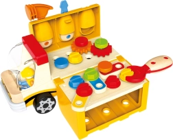 Robustní náklaďák kombinuje dřevo a plast pro dlouhou životnost a lehké ovládání. Odklápěcí korba přidává realistické prvky ke hře.