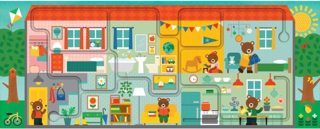 Tato kreativní sada PETIT COLLAGE spojuje puzzle a interaktivní bludiště do jedné hry, která děti zabaví i něco naučí. Po složení 10 velkých dílků vznikne dlouhý obrázek domu (53 × 21,5 cm), ve kterém děti prstem sledují vyznačenou trasu a zároveň objevují 20 ukrytých předmětů.