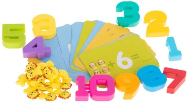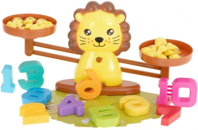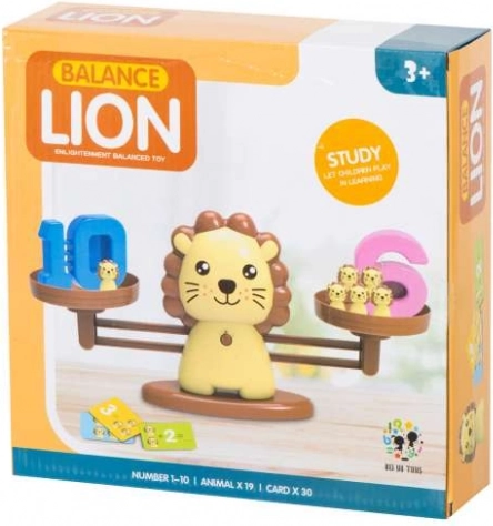 - Váha ve tvaru lva, 19 malých lvíčků, číslice 1–10, 30 karet s matematickými úlohami