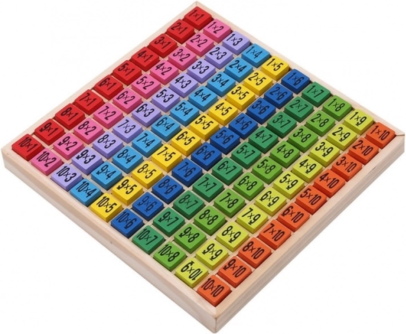 Zábavná a chytrá pomůcka pro děti od 3 let: dřevěná tabulka s 100 barevnými kostkami pro snadné učení násobilky do 10×10. Na každé kostce je příklad násobení a na opačné straně správný výsledek. Živé barvy motivují k objevování, rozvíjejí paměť a koncentraci a promění matematiku v čistou zábavu.