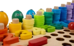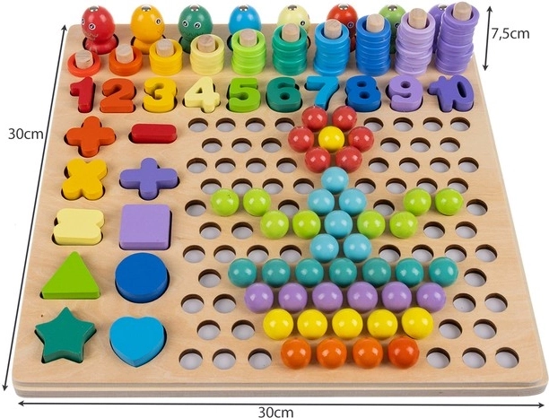 Set obsahuje oboustranné předlohy, číslice, matematické symboly a barevné kroužky i kuličky pro stavění vzorů. Díky dřevěnému základu je hračka odolná a stabilní, pestré barvy motivují ke kreativitě a dítě si snadno osvojí základy matematiky.
