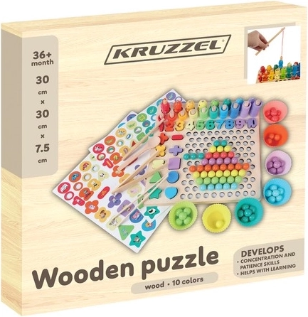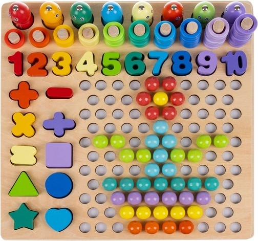Zábavná a vzdělávací dřevěná mozaika s korálky, čísly a tvary rozvíjí dětskou představivost, logické myšlení a jemnou motoriku. Díky bohaté sadě doplňků (pruty, pinzeta, lžička, magnetický prut, karty) nabízí dlouhé hodiny tvořivé hry, trénuje počítání, barvy a tvary a podporuje koordinaci oko–ruka i trpělivost a soustředění.