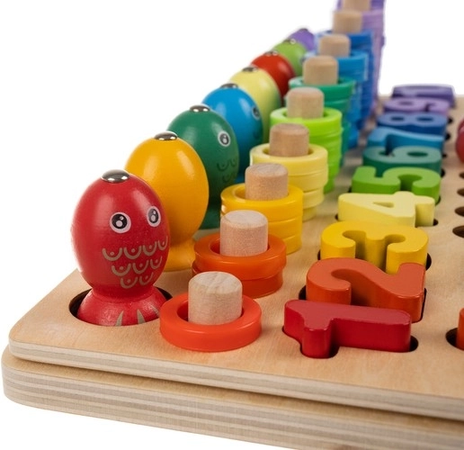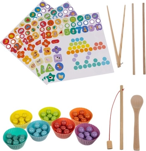 Tato komplexní dřevěná vzdělávací sada kombinuje mozaiku s korálky, skládání tvarů i magnetické rybaření. Děti si hravou formou procvičí počty, třídění barev a rozpoznávání tvarů, zároveň rozvíjejí jemnou motoriku a úchop pomocí pinzety, hůlek a lžičky. Vhodné pro samostatnou hru i společné učení s rodiči.