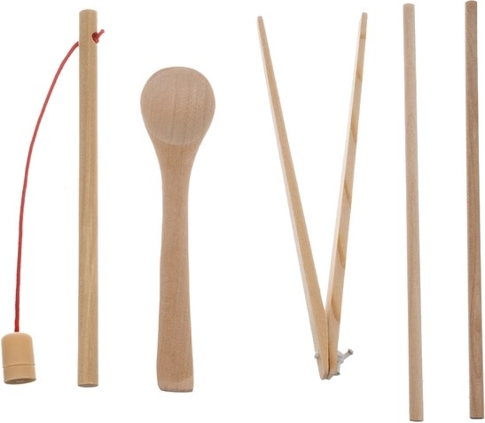 - dřevěná základna, 3 oboustranné plánky, dřevěný nástavec, 7 formiček, pinzeta, udice, lžička, tyčinky, 8 magnetických rybiček, 5 matematických znaků, 10 číslic, 5 tvarů, 55 kroužků, 77 kuliček