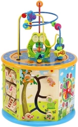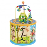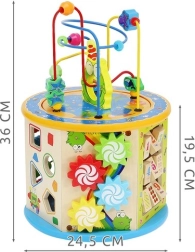 Kuličkový labyrint, tvarový sorter, ozubená kolečka, počítadlo, čísla, hodiny, bludiště a herní panel – vše v jedné stabilní kostce.