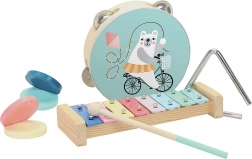 Souprava obsahuje vše potřebné pro malý domácí orchestr: barevný xylofon s paličkou, tamburínu s medvídkem, jasně znějící triangl a pár pohodlných kastanět. Díky ergonomickému provedení se nástroje dobře drží v malých rukách a motivují děti k muzikální hře.