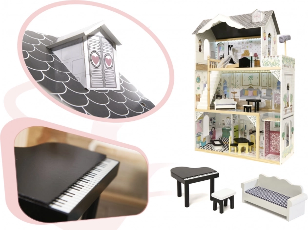 Dřevěný domeček pro panenky se vyznačuje moderním stylem a splní sny každého dítěte. Obsahuje 4 samostatné místnosti, balkon a výtah. Je plně vybaven krásným dřevěným nábytkem, který dokonale doplní každý pokoj v domečku.