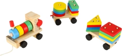Roztomilý dřevěný vláček s lokomotivou a dvěma vagónky je skvělá hračka pro děti od 3 let. Obsahuje barevné kostky a sorter pro procvičení motoriky, učení tvarů a barev a rozvoj logického myšlení. Vláček má pohyblivá kola a šňůrku pro tahání, takže si děti užijí spoustu pohybu i tvořivé hry.