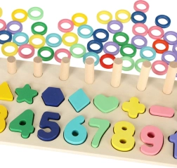 Tato montessori sada spojuje radost ze skládání s učením. Děti přiřazují dřevěné geometrické tvary a čísla do správných otvorů a zároveň na kolíky navlékají barevné kroužky, jejichž počet odpovídá dané číslici. Díky přehledné dřevěné základně je učení přirozené a zábavné.