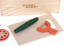 Součástí je prkénko, bezpečný nůž i loupátko. Malí kuchaři si vyzkouší přípravu jídla krok za krokem – od loupání po krájení.